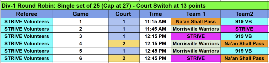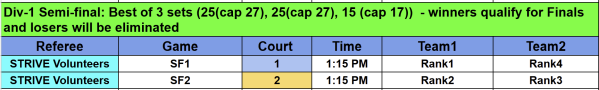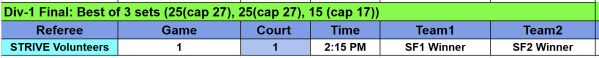 In the rare event of a tie, head to head record will be taken into consideration or time permissable a game of single set for 15 points will be played to determine the final ranking.